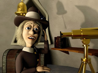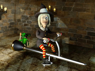 She does have a cauldron, pointy hat, broomstick and does cast spells, but she too usually gets her spells wrong. This is primarily due to the fact that she is getting on a bit and her mind is getting a bit fuddled... At twelve o'clock midnight (the witching hour) she can be seen flying around on her rocket-powered broomstick, and although she hasn't yet fallen off she has come close. She sometimes drops into Bella's igloo when Hannah is there to tell them stories by the fire of things that happened centuries ago because she is about six hundred years old. In fact nobody really knows how old she is, not even Witchy Peg! Most Witches have a familiar in the shape of a cat, owl or bat. Witchy Peg however, has a goblin - 'Alf' the goblin. |
